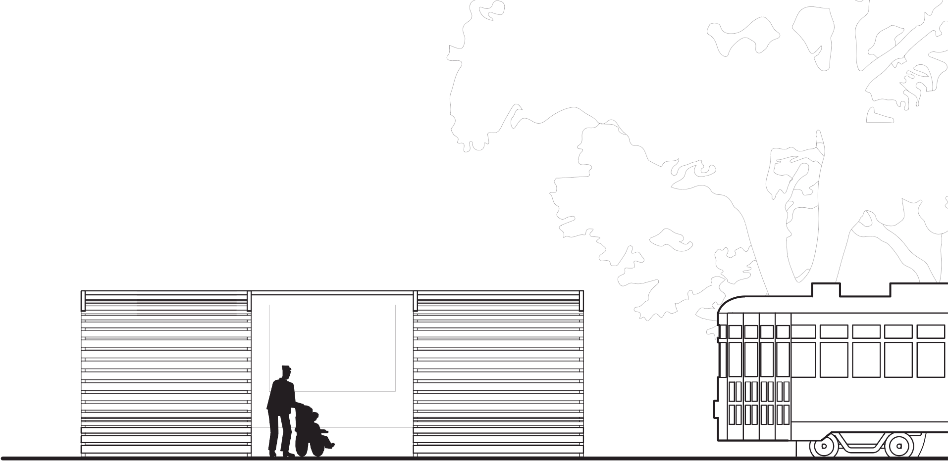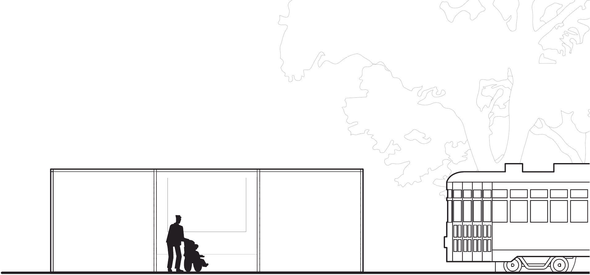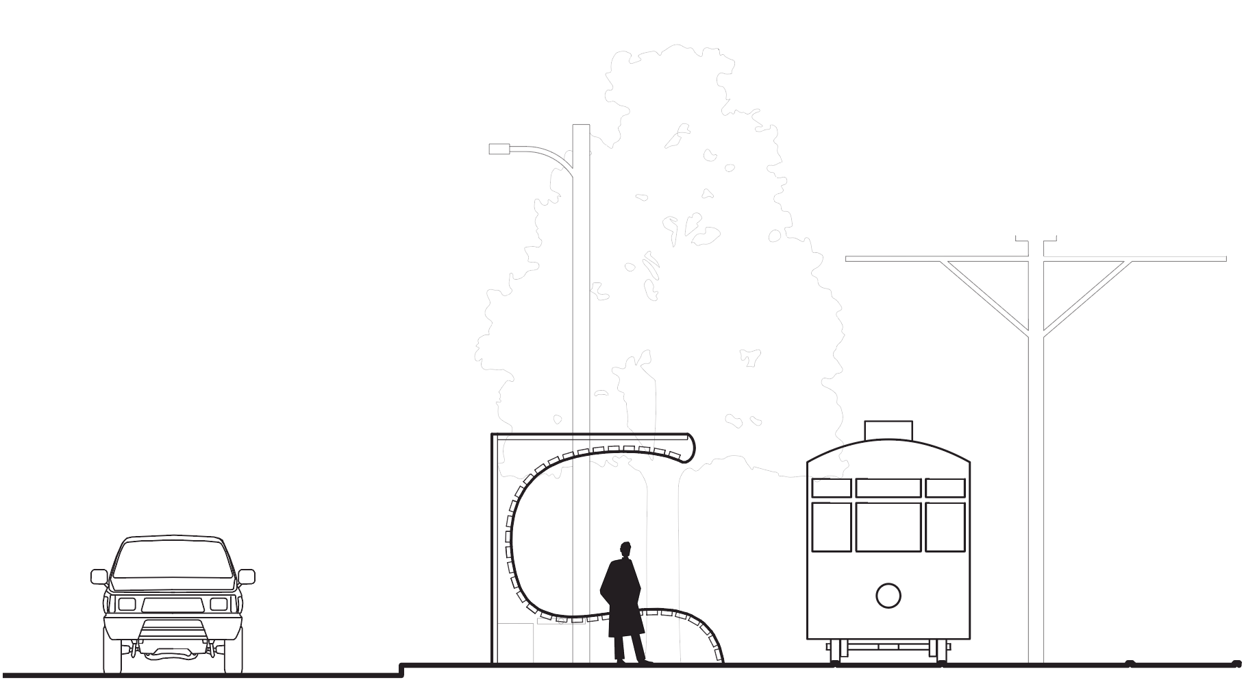 The wave pavilion allows users to spend their time waiting for the streetcar by experiencing the feeling of surfing and being immersed in a wave. A loosely-bolted platform allows the user to test their balance. The three sections of the pavilion along the curve of the wave allow for children to play along the slope, passengers to comfortably wait under shelter, or core strength aficionados to try the balancing apparatus.